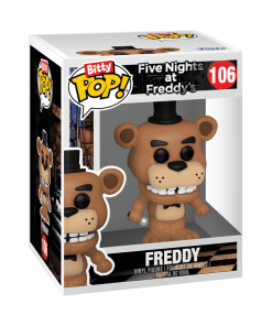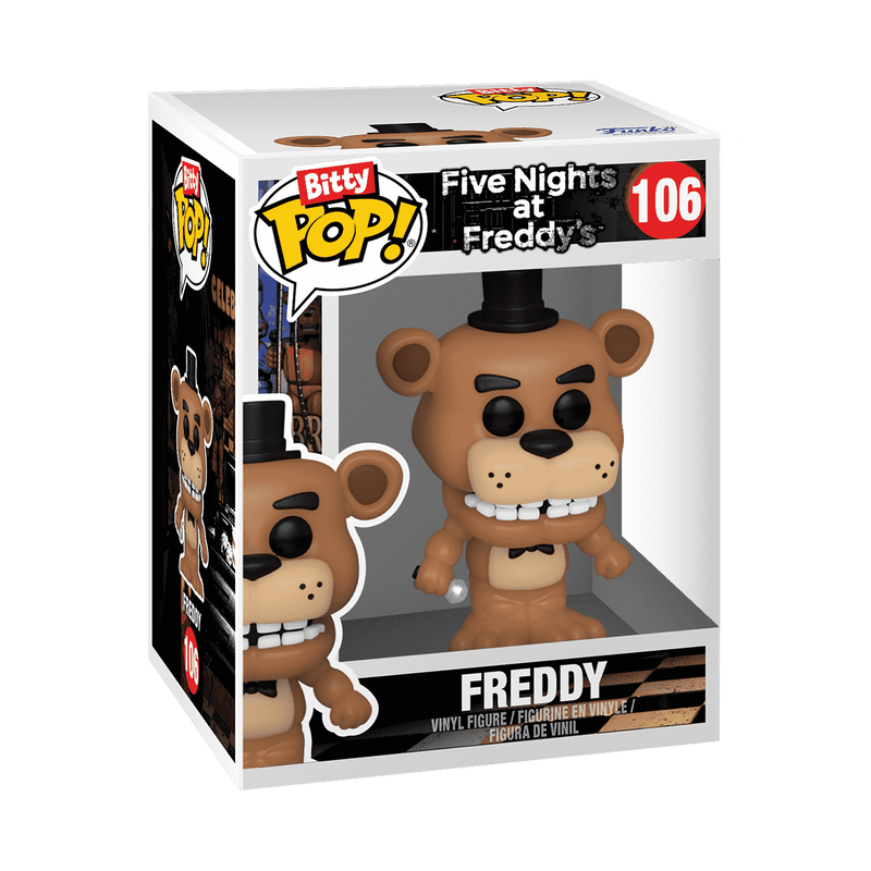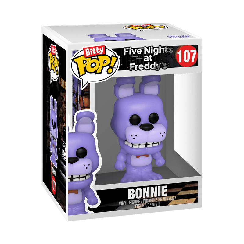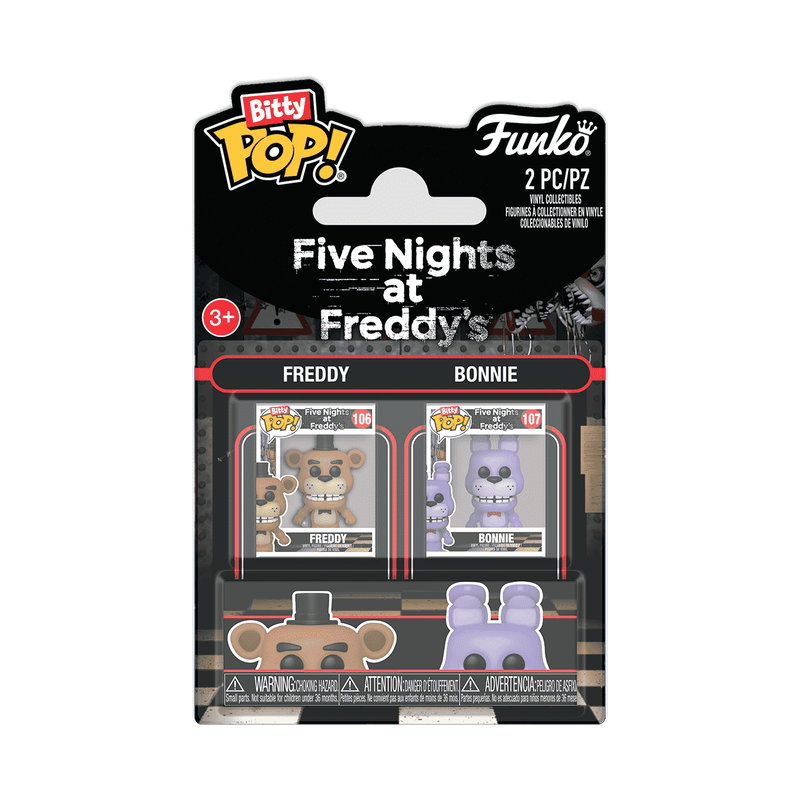 The world of POP! is getting bigger—and smaller—with Bitty POP! collectibles! Expand your Five Nights at Freddy’s™ collection with this 2-pack featuring Bitty POP! Freddy and Bitty POP! Bonnie! Bitty POP! collectibles are packaged in hard acrylic cases with detachable bottom lids. Detachable bottom lids double as acrylic bases, to which the Bitty POP! figures are adhered. Vinyl figures are approximately 0.9 in (2.3 cm) tall.