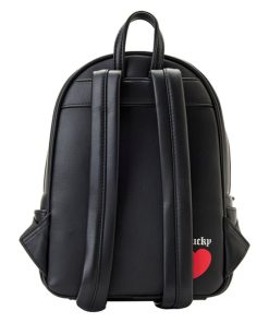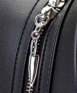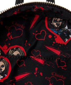 Here comes the bride—dressed in killer style! Pack for an escape with this Loungefly Universal Bride of Chucky Tiffany Cosplay Mini Backpack. The front of this backpack features Tiffany’s bridal outfit from the neck down, including a real Tiffany necklace in shiny gold-colored metal! Silver metal pieces, zippers, and applique details bring her leather jacket to life. A fully functioning belt closes at her waist. Tiffany’s dress is made of white satin, and one of the silver zipper pulls on her jacket is shaped like a knife. There’s even a detail of her Chucky tattoo with a red heart, right above her bodice. On the back, the word Chucky, and a red heart with a dagger through it, are embroidered. This backpack is the perfect accessory for packing your creepy dolls—or your necessities for everyday outings.