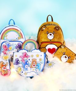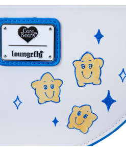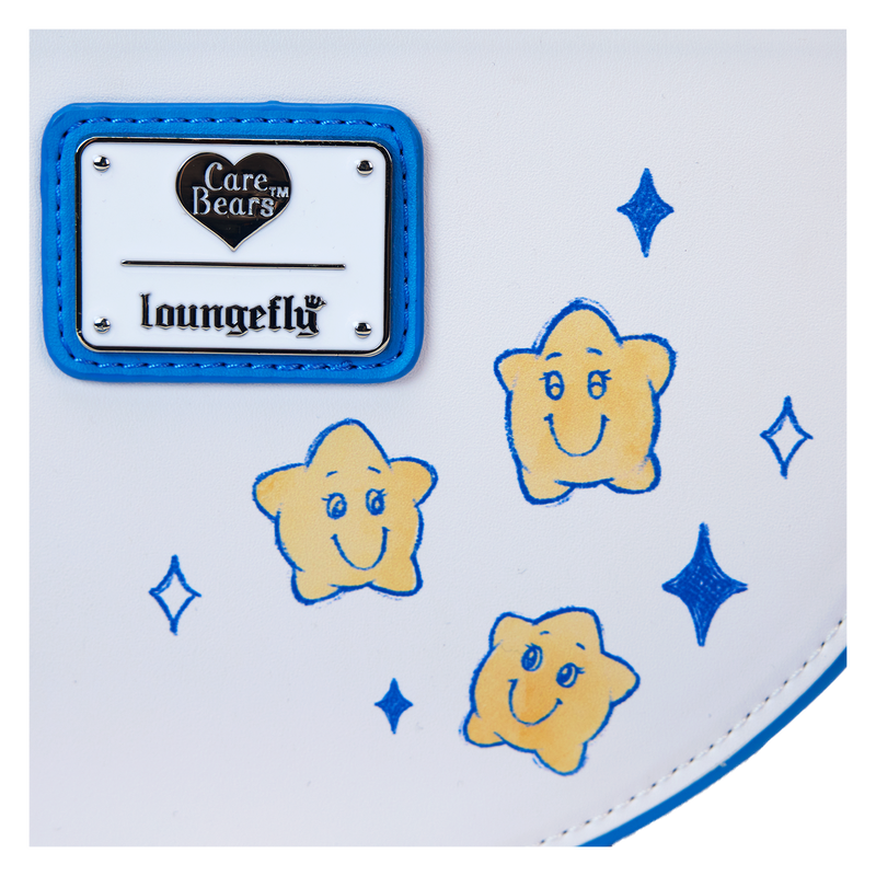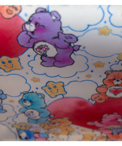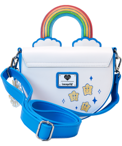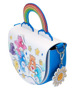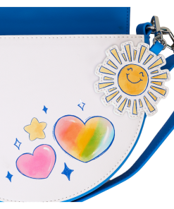 Prepare to stare! This Care Bears™ crossbody bag is carefully designed to bring so much joy. The front flap of this half-moon style bag features an applique of Cheer Bear™ standing on the shoulders of Grumpy Bear™, and they’re surrounded by other Care Bears who are playing among the clouds. Lift the flap, and you’ll find colorful print hearts. The handle is a padded applique in the shape and colors of a rainbow! Two applique clouds appear below, and a detachable vegan leather charm of a smiling sun tops off the look. Pack just what you need for the day to gather your friends and spread kindness wherever you go.