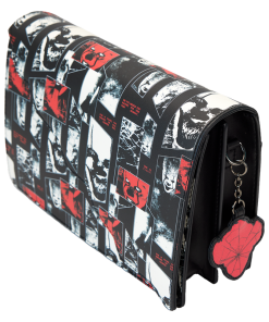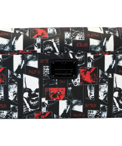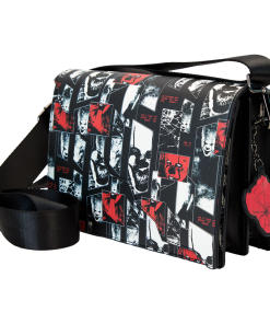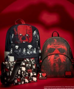 Finish it for good—your look, that is. Head to Derry in style with our IT: Chapter 2 crossbody bag. All-over eerie images of Pennywise the Clown in red, and as “photo negatives,” take center stage. In the dark, portions of the print glow! A jagged, die-cut front flap gives the look a fashionably sharp edge, and a vegan leather charm of Pennywise’s face, in red, tops off the look. Pack just what you need for the day to chase down adventures with a few good friends.