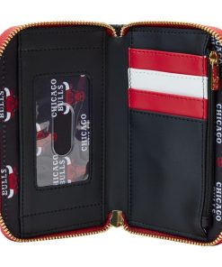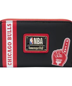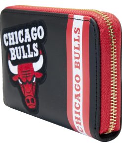 Cheer on your favorite team with a game-winning play for your collection! The Loungefly NBA Chicago Bulls Patch Icons Zip Around Wallet features embroidered patches on the front and back. The team’s name appears in a strip of red and white, contrasting the wallet’s black background. With four slots for holding cards and a clear slot to hold ID, this game-day-ready accessory has plenty of room to carry your gear while sporting your team spirit.