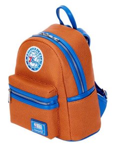 Set your team spirit free with this NBA Philadelphia 76ers Basketball Logo Mini Backpack. The embroidered red-white-and-blue 76ers logo patch prominently appears over the front zipped compartment. This logo also displays the word “PHILADELPHIA” inside a circle, with a white basketball in the middle. A pebble vegan leather (polyurethane) material adds texture, recalling the look and feel of a basketball. Blue trim adds contrast and accent in team uniform color.