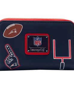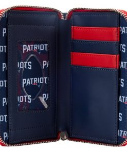 The Loungefly NFL New England Patriots Patches Zip Around Wallet is made of vegan leather (polyurethane). Wallet zips closed and has sturdy metal hardware. Additional features include applique patch and printed details. Take note of the coordinating inside lining.