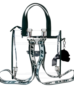 Feeling game-day ready? Cheer on your favorite football team with this convertible tote bag! The clear design makes it easy to bring your belongings into the stadium, and versatile shoulder straps help to keep your bag close as you wander the crowds. A chenille patch of the Jets logo, a helmet-shaped bag charm, and coordinating team colors give this bag an elevated look. No need to sacrifice your style at the big game – this accessory is the perfect combination of fashion and function.
