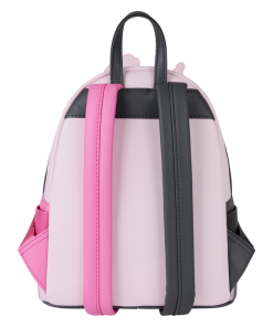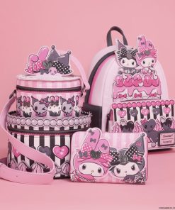 My Melody and Kuromi sit together on top of a three-tiered cake! It’s decorated with pink and black frosting to match each of their aesthetics. On one side pocket, you’ll find a pink polka dot bow and on the other pocket, you’ll find a black polka dot bow! Even the straps are two different colors – one is pink and one is black.