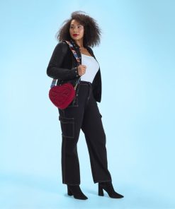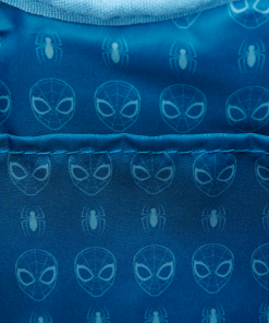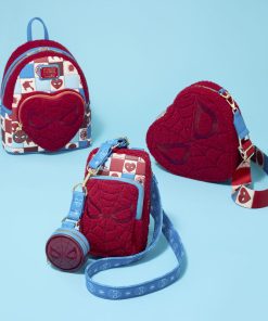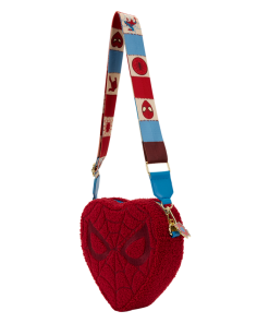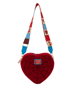 This crossbody bag is in the shape of a heart and features Spider-Man’s mask! It’s covered in sherpa material. Along the strap, you’ll find various symbols of Spider-Man in squares that look stitched together. This is a super sweet accessory that’s perfect to show off your favorite super hero!