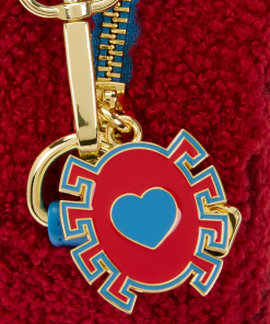 - Enamel zipper charm, jacquard, sherpa, and printed details